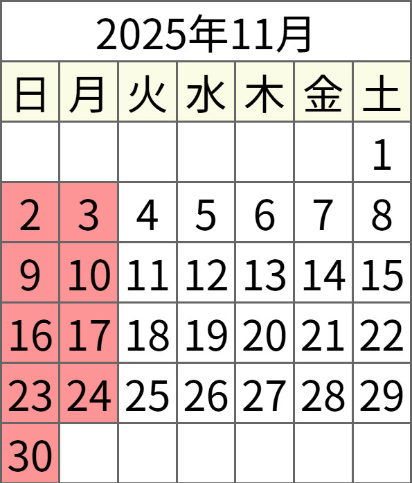 《営業日のお知らせ》 ![]() ■休業日 □営業日 △予約営業日(2営業日前までに予約をお願いいたします。) 営業時間:10時~17時 |