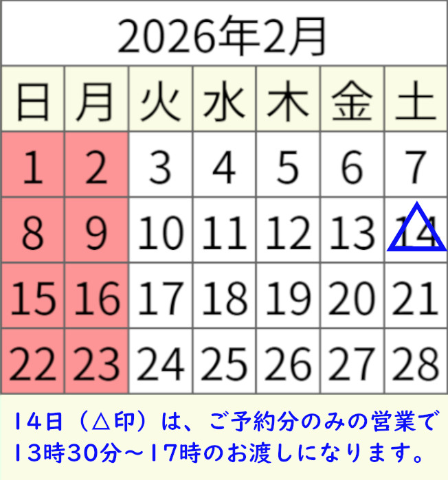 《営業日のお知らせ》 ![]() ■休業日 □営業日 営業時間:10時~17時 |
