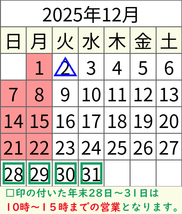《営業日のお知らせ》 ![]() ■休業日 □営業日 △予約営業日(2営業日前までに予約をお願いいたします。) 営業時間:10時~17時 |