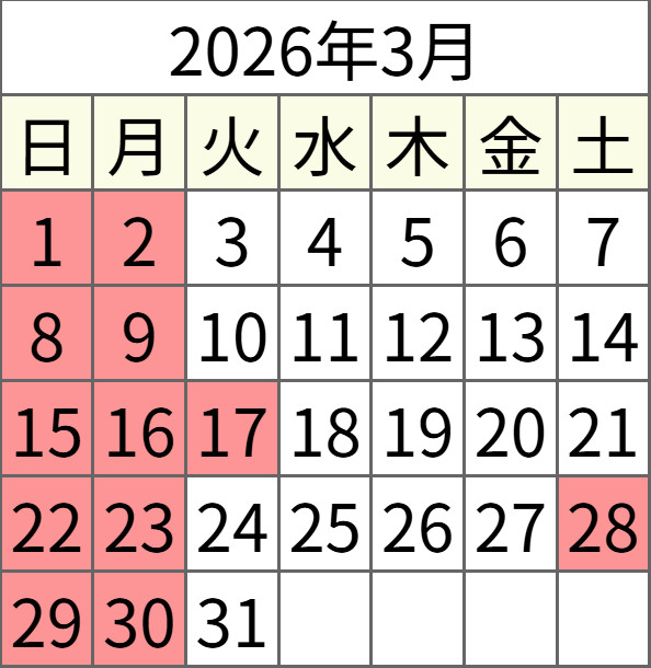 《営業日のお知らせ》 ![]() ■休業日 □営業日 営業時間:10時~17時 |